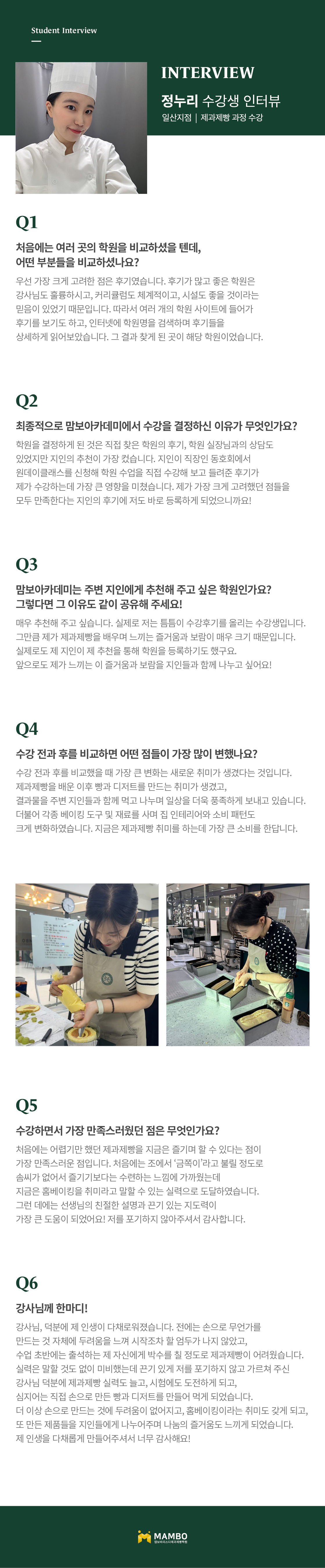 제1조 (개인정보 수집에 대한 동의)맘보교육그룹(이하 회사)는 이용자들이 회사의 개인정보취급방침 또는 이용약관의 내용에 대하여 “동의”버튼 또는 “취소”버튼을 클릭할 수 있는 절차를 마련하여, “동의”버튼을 클릭하면 개인정보 수집에 대해 동의한 것으로 봅니다. 제2조 (개인정보 수집항목) 온라인 문의를 통한 상담을 위해 처리하는 개인정보 항목은 아래와 같습니다. 수집항목 : 성명, 이메일, 전화번호 제3조 (개인정보의 이용목적) 회사는 이용자의 사전 동의 없이는 이용자의 개인 정보를 공개하지 않으며, 원활한 고객상담, 각종 서비스의 제공을 위해 아래와 같이 개인정보를 수집하고 있습니다. 모든 정보는 상기 목적에 필요한 용도 이외로는 사용되지 않으며 수집 정보의 범위나 사용 목적, 용도가 변경될 시에는 반드시 사전 동의를 구할 것입니다. - 성명 : 제품상담에 따른 본인 확인 - 이메일, 전화번호 : 제품상담 및 이벤트 관련 고지사항 전달, 새로운 서비스 및 신상품 정보 제공(DM, SMS, 이메일 등 이용) 이용자는 개인정보의 수집/이용에 대한 동의를 거부할 수 있습니다. 다만, 동의를 거부하는 경우 온라인 문의를 통한 상담은 불가하며 서비스 이용 및 혜택 제공에 제한을 받을 수 있습니다. 제4조 (개인정보의 보유 및 이용기간) 원칙적으로 개인정보 수집 및 이용목적이 달성된 후에는 해당 정보를 지체 없이 파기합니다. 그리고 상법, 전자상거래 등에서의 소비자보호에 관한 법률 등 관계법렵의 규정에 의하여 보존할 필요가 있는 경우 회사는 관계법령에서 정한 일정한 기간 동안 정보를 보관합니다. 이 경우 회사는 보관하는 정보를 그 보관의 목적으로만 이용하며 보존기간은 아래와 같습니다. - 계약 또는 청약철회 등에 관한 기록 : 5년(전자상거래등에서의 소비자보호에 관한 법률) - 소비자의 불만 또는 분쟁처리에 관한 기록 : 3년(전자상거래등에서의 소비자 보호에 관한 법률) - 시용정보의 수집/처리 및 이용 등에 관한 기록 : 3년(신용정보의 이용 및 보호에 관한 법률) - 회사는 귀중한 이용자의 개인정보를 안전하게 처리하며, 유출의 방지를 위하여 다음과 같은 방법을 통하여 개인정보를 파기합니다. - 종이에 출력된 개인정보는 분쇄기로 분쇄하거나 소각을 통하여 파기합니다. - 전자적 파일 형태로 저장된 개인정보는 기록을 재생할 수 없는 기술적 방법을 사용하여 삭제합니다.