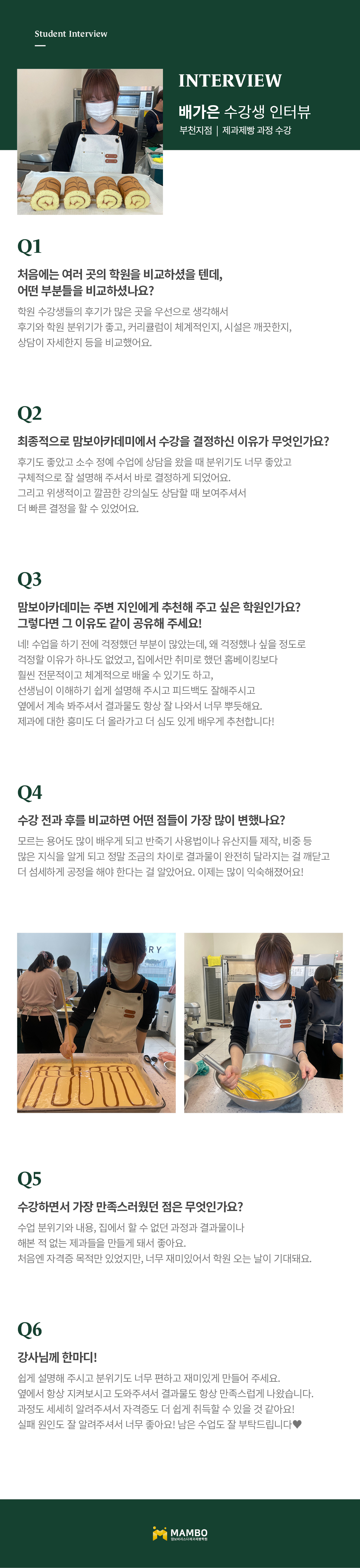 제1조 (개인정보 수집에 대한 동의)맘보교육그룹(이하 회사)는 이용자들이 회사의 개인정보취급방침 또는 이용약관의 내용에 대하여 “동의”버튼 또는 “취소”버튼을 클릭할 수 있는 절차를 마련하여, “동의”버튼을 클릭하면 개인정보 수집에 대해 동의한 것으로 봅니다. 제2조 (개인정보 수집항목) 온라인 문의를 통한 상담을 위해 처리하는 개인정보 항목은 아래와 같습니다. 수집항목 : 성명, 이메일, 전화번호 제3조 (개인정보의 이용목적) 회사는 이용자의 사전 동의 없이는 이용자의 개인 정보를 공개하지 않으며, 원활한 고객상담, 각종 서비스의 제공을 위해 아래와 같이 개인정보를 수집하고 있습니다. 모든 정보는 상기 목적에 필요한 용도 이외로는 사용되지 않으며 수집 정보의 범위나 사용 목적, 용도가 변경될 시에는 반드시 사전 동의를 구할 것입니다. - 성명 : 제품상담에 따른 본인 확인 - 이메일, 전화번호 : 제품상담 및 이벤트 관련 고지사항 전달, 새로운 서비스 및 신상품 정보 제공(DM, SMS, 이메일 등 이용) 이용자는 개인정보의 수집/이용에 대한 동의를 거부할 수 있습니다. 다만, 동의를 거부하는 경우 온라인 문의를 통한 상담은 불가하며 서비스 이용 및 혜택 제공에 제한을 받을 수 있습니다. 제4조 (개인정보의 보유 및 이용기간) 원칙적으로 개인정보 수집 및 이용목적이 달성된 후에는 해당 정보를 지체 없이 파기합니다. 그리고 상법, 전자상거래 등에서의 소비자보호에 관한 법률 등 관계법렵의 규정에 의하여 보존할 필요가 있는 경우 회사는 관계법령에서 정한 일정한 기간 동안 정보를 보관합니다. 이 경우 회사는 보관하는 정보를 그 보관의 목적으로만 이용하며 보존기간은 아래와 같습니다. - 계약 또는 청약철회 등에 관한 기록 : 5년(전자상거래등에서의 소비자보호에 관한 법률) - 소비자의 불만 또는 분쟁처리에 관한 기록 : 3년(전자상거래등에서의 소비자 보호에 관한 법률) - 시용정보의 수집/처리 및 이용 등에 관한 기록 : 3년(신용정보의 이용 및 보호에 관한 법률) - 회사는 귀중한 이용자의 개인정보를 안전하게 처리하며, 유출의 방지를 위하여 다음과 같은 방법을 통하여 개인정보를 파기합니다. - 종이에 출력된 개인정보는 분쇄기로 분쇄하거나 소각을 통하여 파기합니다. - 전자적 파일 형태로 저장된 개인정보는 기록을 재생할 수 없는 기술적 방법을 사용하여 삭제합니다.