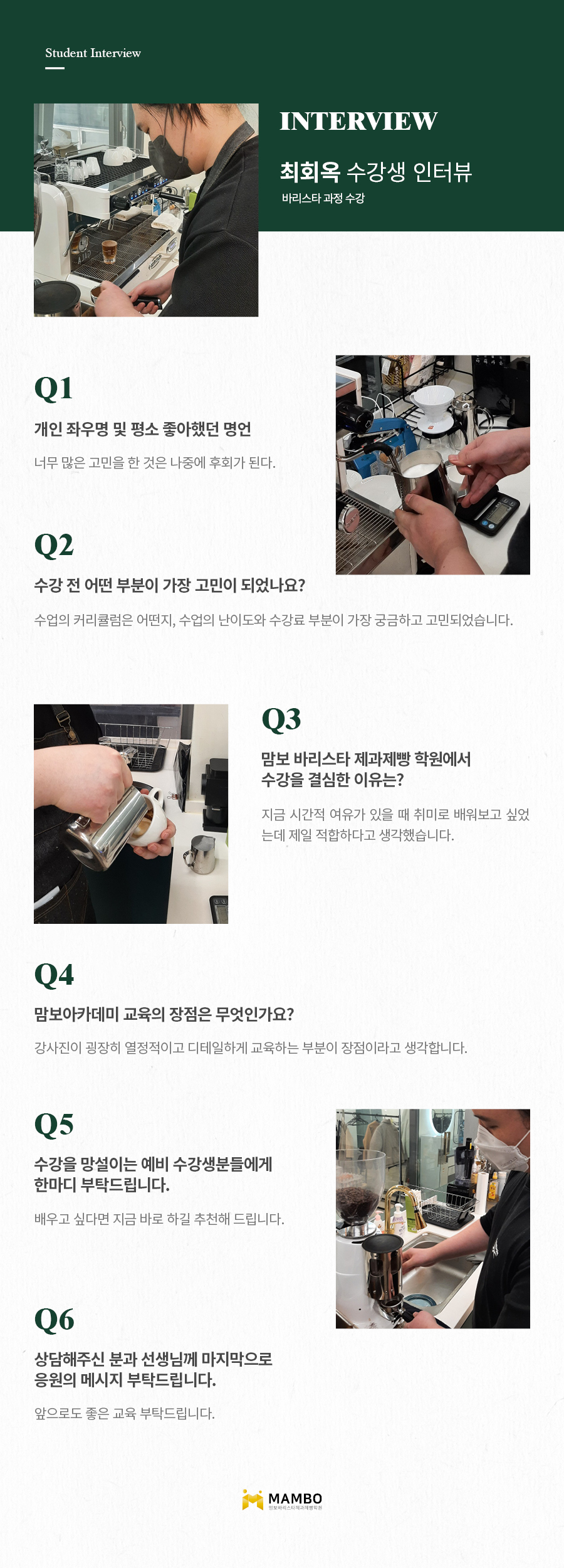 제1조 (개인정보 수집에 대한 동의)맘보교육그룹(이하 회사)는 이용자들이 회사의 개인정보취급방침 또는 이용약관의 내용에 대하여 “동의”버튼 또는 “취소”버튼을 클릭할 수 있는 절차를 마련하여, “동의”버튼을 클릭하면 개인정보 수집에 대해 동의한 것으로 봅니다. 제2조 (개인정보 수집항목) 온라인 문의를 통한 상담을 위해 처리하는 개인정보 항목은 아래와 같습니다. 수집항목 : 성명, 이메일, 전화번호 제3조 (개인정보의 이용목적) 회사는 이용자의 사전 동의 없이는 이용자의 개인 정보를 공개하지 않으며, 원활한 고객상담, 각종 서비스의 제공을 위해 아래와 같이 개인정보를 수집하고 있습니다. 모든 정보는 상기 목적에 필요한 용도 이외로는 사용되지 않으며 수집 정보의 범위나 사용 목적, 용도가 변경될 시에는 반드시 사전 동의를 구할 것입니다. - 성명 : 제품상담에 따른 본인 확인 - 이메일, 전화번호 : 제품상담 및 이벤트 관련 고지사항 전달, 새로운 서비스 및 신상품 정보 제공(DM, SMS, 이메일 등 이용) 이용자는 개인정보의 수집/이용에 대한 동의를 거부할 수 있습니다. 다만, 동의를 거부하는 경우 온라인 문의를 통한 상담은 불가하며 서비스 이용 및 혜택 제공에 제한을 받을 수 있습니다. 제4조 (개인정보의 보유 및 이용기간) 원칙적으로 개인정보 수집 및 이용목적이 달성된 후에는 해당 정보를 지체 없이 파기합니다. 그리고 상법, 전자상거래 등에서의 소비자보호에 관한 법률 등 관계법렵의 규정에 의하여 보존할 필요가 있는 경우 회사는 관계법령에서 정한 일정한 기간 동안 정보를 보관합니다. 이 경우 회사는 보관하는 정보를 그 보관의 목적으로만 이용하며 보존기간은 아래와 같습니다. - 계약 또는 청약철회 등에 관한 기록 : 5년(전자상거래등에서의 소비자보호에 관한 법률) - 소비자의 불만 또는 분쟁처리에 관한 기록 : 3년(전자상거래등에서의 소비자 보호에 관한 법률) - 시용정보의 수집/처리 및 이용 등에 관한 기록 : 3년(신용정보의 이용 및 보호에 관한 법률) - 회사는 귀중한 이용자의 개인정보를 안전하게 처리하며, 유출의 방지를 위하여 다음과 같은 방법을 통하여 개인정보를 파기합니다. - 종이에 출력된 개인정보는 분쇄기로 분쇄하거나 소각을 통하여 파기합니다. - 전자적 파일 형태로 저장된 개인정보는 기록을 재생할 수 없는 기술적 방법을 사용하여 삭제합니다.